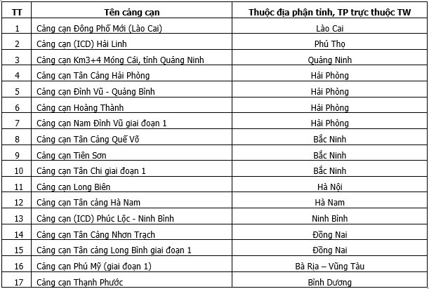Theo Quyết định, Danh mục cảng cạn Việt Nam được công bố bao gồm: