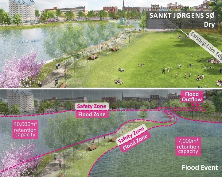 Copenhagen đã xây dựng một kế hoạch toàn diện để quản lý lũ quét, bao gồm xây các hồ chứa nước ngầm, các bề mặt thấm và các công viên đa chức năng đóng vai trò như các khu vực chứa nước lũ.