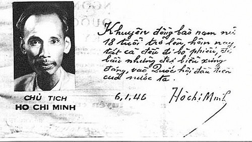 Hôm nay toàn quốc chúng ta làm lễ kỷ niệm ngày vĩ đại của dân tộc: ngày Tổng tuyển cử. Ngày 6/1/1946 là ngày đầu tiên trong lịch sử Việt Nam mà nhân dân ta, từ 18 tuổi trở lên, không phân biệt trai gái, giàu nghèo, tín ngưỡng và chính kiến đã trực tiếp chọn lựa những người thay mặt cho mình để xây dựng nước Việt Nam Dân chủ Cộng hòa, nước của nhân dân, bằng cách thảo một bản Hiến pháp dân chủ, và hơn nữa, để tổ chức một chính quyền dân chủ nhân dân, mà nhiệm vụ của nó là chỉ đạo mọi việc nội trị và ngoại giao.