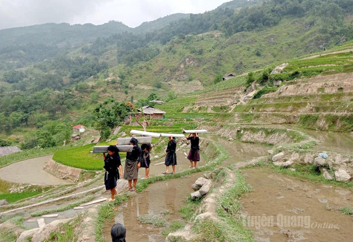 “Làm cái nhà này, cả bản phải cõng từng viên gạch bi lên dốc, không thì không có vật liệu mà làm đâu” - câu nói giản dị của anh Sùng Chứ Co, thôn Há Đề, xã Lũng Phìn gói trọn nỗi gian nan mà những con người nơi đây đã trải qua. Ở Tuyên Quang, việc vận chuyển vật liệu xây dựng hoàn toàn bằng sức người không phải là chuyện hiếm. Có hộ chỉ phải gùi, vác vài chục mét nhưng có những gia đình phải vượt qua vài kilômét đường mòn lưng chừng dốc. Ngày nào trời mưa, đường đất trơn trượt, vài người phải cùng nhau đẩy, kéo mới lên được dốc.