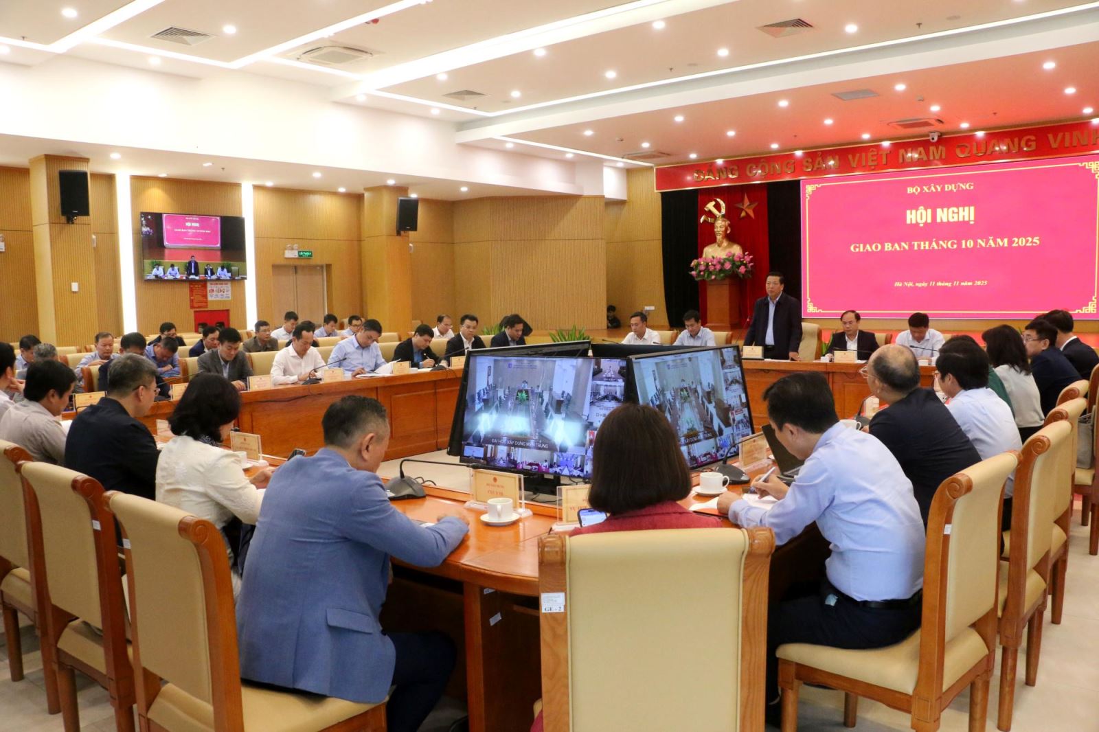 On the afternoon of November 11, Minister Tran Hong Minh chaired the October meeting. Deputy Ministers, leaders of Departments, Offices, Institutes, and Project Management Boards under the Ministry attended the meeting.