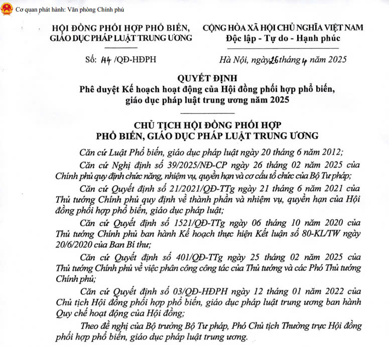 Ngày 26/4/2025, Phó Thủ tướng Chính phủ Lê Thành Long, Chủ tịch Hội đồng phối hợp phổ biến, giáo dục pháp luật trung ương (Hội đồng trung ương) đã ký ban hành Quyết định số 44/QĐ-HĐPH phê duyệt Kế hoạch hoạt động của Hội đồng trung ương năm 2025.