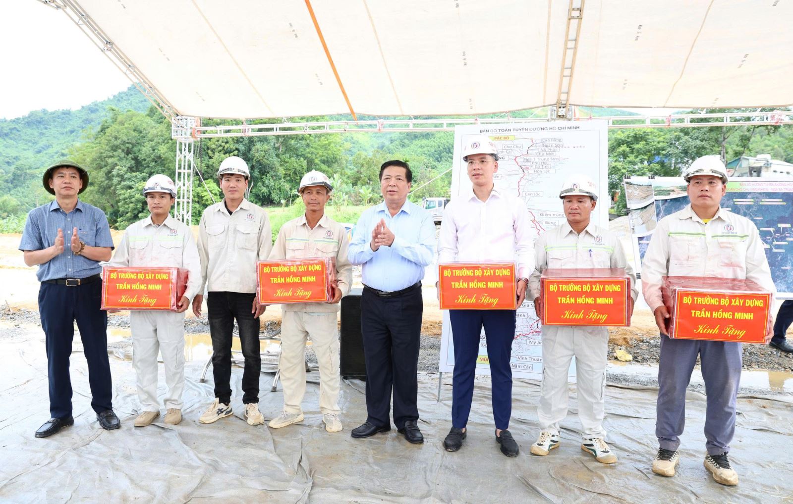 Bộ trưởng Trần Hồng Minh tặng quà động viên các nhà thầu, công nhân thi công tại công trường. Ảnh: Báo Xây dựng