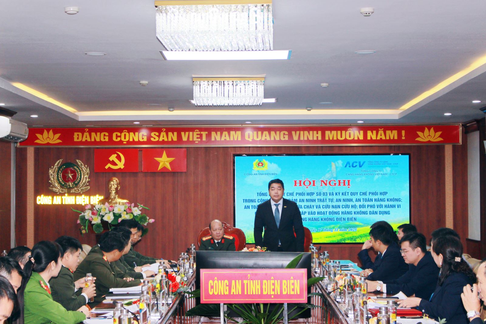 Ngày 17/11, Tổng công ty Cảng hàng không Việt Nam - CTCP (ACV) và Công an tỉnh Điện Biên đã tổ chức Hội nghị tổng kết công tác phối hợp theo Quy chế số 03 và ký kết Quy chế phối hợp mới. Quy chế này nhằm tăng cường toàn diện công tác bảo đảm an ninh trật tự, an toàn hàng không, phòng cháy chữa cháy (PCCC) và cứu nạn cứu hộ (CNCH) cũng như chủ động đối phó với các hành vi can thiệp bất hợp pháp vào hoạt động hàng không dân dụng tại Cảng hàng không Điện Biên.